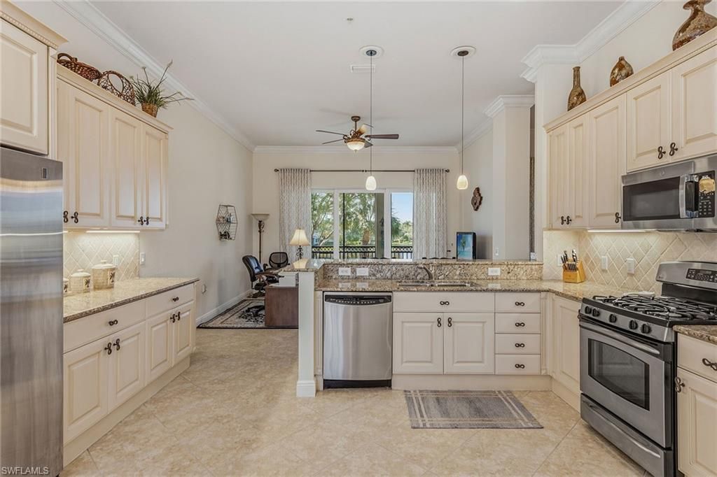 Experience bright southern exposure and stunning expansive lake views surrounded by lush, tropical landscaping in this beautifully maintained second-floor residence in the popular Laguna neighborhood in desirable Fiddlers Creek community. Filled with natural light and designed for effortless indoor-outdoor living, this spacious three-bedroom, three-full-bath home offers a generous layout with soaring ceilings, impact doors and windows, and an expansive lanai that creates a serene retreat overloo...Experience bright southern exposure and stunning expansive lake views surrounded by lush, tropical landscaping in this beautifully maintained second-floor residence in the popular Laguna neighborhood in desirable Fiddlers Creek community. Filled with natural light and designed for effortless indoor-outdoor living, this spacious three-bedroom, three-full-bath home offers a generous layout with soaring ceilings, impact doors and windows, and an expansive lanai that creates a serene retreat overlooking peaceful water views and palm trees. An attached two-car garage enhances everyday convenience, while the homes elevated position provides exceptional privacy, sunlight and an inviting sense of openness throughout. Inside, diagonal tile flooring flows through the main living areas, complemented by crown molding and abundant windows that frame the lake. The kitchen is stylish and functional, featuring granite countertops, a tile backsplash, recessed lighting with under-cabinet accents, a breakfast bar counter, pantry, and stainless-steel appliances, including a natural gas range, newer microwave, refrigerator with ice maker and dishwasher. A cozy dining area sits beside a large window, creating a morning breakfast spot. The formal living room, with an adjoining dining area, and the family room each offer glass sliders that open to the oversized screened lanai. A large covered outdoor living area, tile flooring and dual ceiling fans enhance year-round enjoyment. The owners suite is a peaceful waterfront sanctuary with beautiful lake views, private lanai access, and two walk-in closets with wood-slat shelving. The en-suite bath features a dual sink vanity with a full-width mirror and makeup counter, a walk-in shower with glass enclosure, and a separate soaking tub. The spacious first guest bedroom offers double-door entry, arched windows with white plantation shutters, and an en-suite bath with a walk-in shower that also provides convenient hall access. The second guest bedroom is equally inviting with its own en-suite bath featuring a walk-in shower with glass enclosure. A well-appointed laundry room includes a storage closet, built-in ironing board, utility sink with granite and mosaic tile backsplash, overhead cabinetry, and an LG top-load washer and LG front-load dryer, both newer, for added convenience. Additional upgrades include a tankless water heater, contributing to efficiency and enhanced comfort. Residents of Fiddlers Creek enjoy ample options for walking and bicycling, and world-class recently-renovated amenities, including a state-of-the-art fitness center, six tennis courts and 10 new pickleball courts, bocce, spa services, sauna, steam room, hot tub, fine and casual dining, and a spectacular resort-style pool with waterfalls and slides. Optional memberships for golf, beach and marina access further elevate the lifestyle, with a new golf clubhouse and a recently renovated golf course.